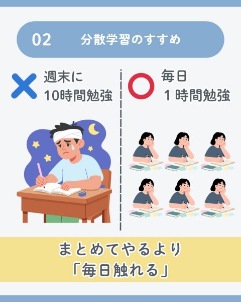 - 脳は「何度も出会う情報」を記憶します。1日10分でもいいから、毎日同じ教科に触れることが大切です。