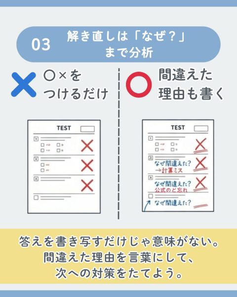 - 「計算ミス」「問題文の読み飛ばし」「理解不足」…間違えた理由を言葉にして、次への対策を立てましょう。